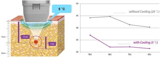 脂肪細胞を破壊する従来の機器は、照射を受けている最中の熱さや痛みがかなり強いことが最大の欠点でした。リポセル(LIPOcel)には高度な冷却機能「コンタクトクーリング機能」が搭載されています。この冷却機能は、HIFU(ハイフ)照射中も皮膚の表面を5℃まで冷やし続けることができる機能です。この機能により、フルパワーでHIFU(ハイフ)を照射しても、皮下脂肪層の温度が上がるにもかかわらず、皮膚は強力な冷却機能に守られているため、火傷の心配がなく、痛みも抑えることが可能になりました。