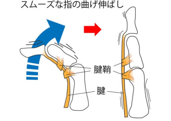手の指には、「(屈筋)腱」と、腱が離れないようにトンネルのような役割をする「(靭帯性)腱鞘」という組織があり、腱が腱鞘の中を移動することで、スムーズな手の指の曲げ伸ばしが可能になっています。
