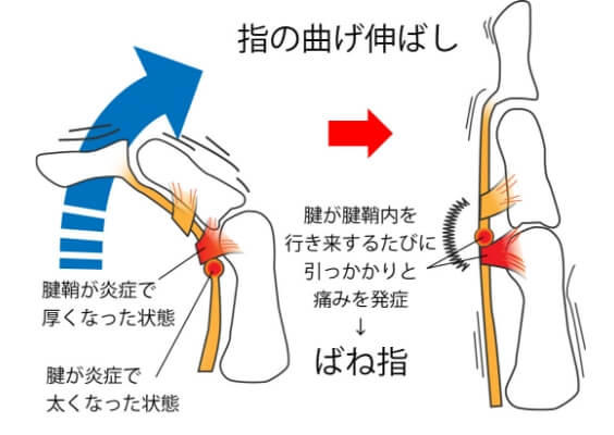 ところが、何かしらの原因で腱鞘に炎症が起きると、腫れて厚くなり、腱の通り道も狭くなり、腱と腱鞘が擦れて痛みを感じるようになります。 擦れた腱にも炎症が起きて太くなり、腱が腱鞘内を通過する際に引っかかるようになります。そのため、スムーズな動きが失われ、指が曲がったまま伸びにくくなるという症状になります。さらに、曲がった指を戻そうとして、無理に強い力をかけると、太くなった腱が腱鞘との引っかかりを通過する時に、急に指が伸びる「ばね現象」が起こります。これが「弾発指(ばね指)」のメカニズムになります。