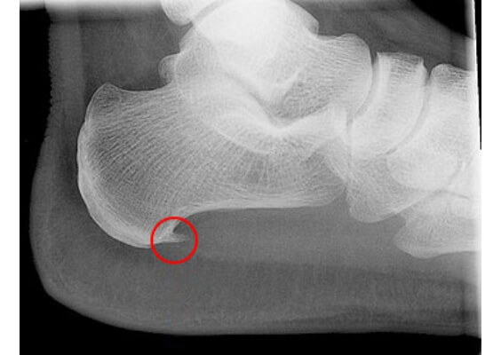 レントゲンでは踵(かかと)にトゲ状(骨棘)の画像(※レントゲン画像参照)が認められることが多く、エコーでは微細損傷や炎症が認められることが多いです。