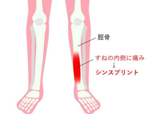 シンスプリントは、脛骨過労性骨膜炎(けいこつかろうせいこつまくえん)とも呼ばれるランニング初心者が陥りやすいランニング障害です。運動中や運動後に足のすねの内側(下方1/3あたり)に痛みが生じます。