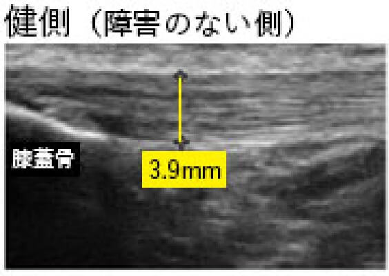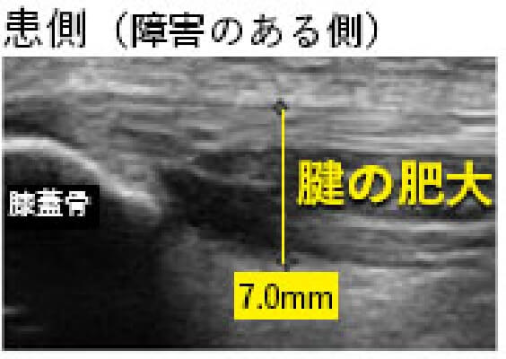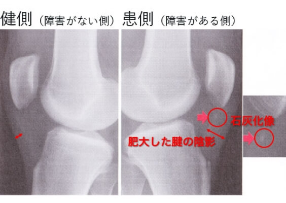 患側(障害がある側)では健側(障害がない側)と比較して腫大した腱の陰影が認められます。赤い丸印の部分は膝蓋腱部の石灰化像です。
