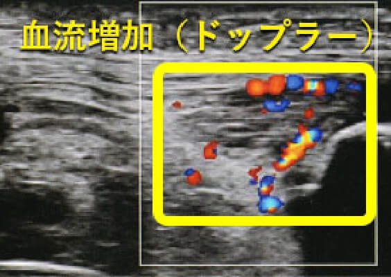 超音波エコー画像診断により腱の肥大、Fibrillar pattern (線状高エコー像の層状配列)の開大・不整・消失、ドップラーによる血流増加などが認められます。